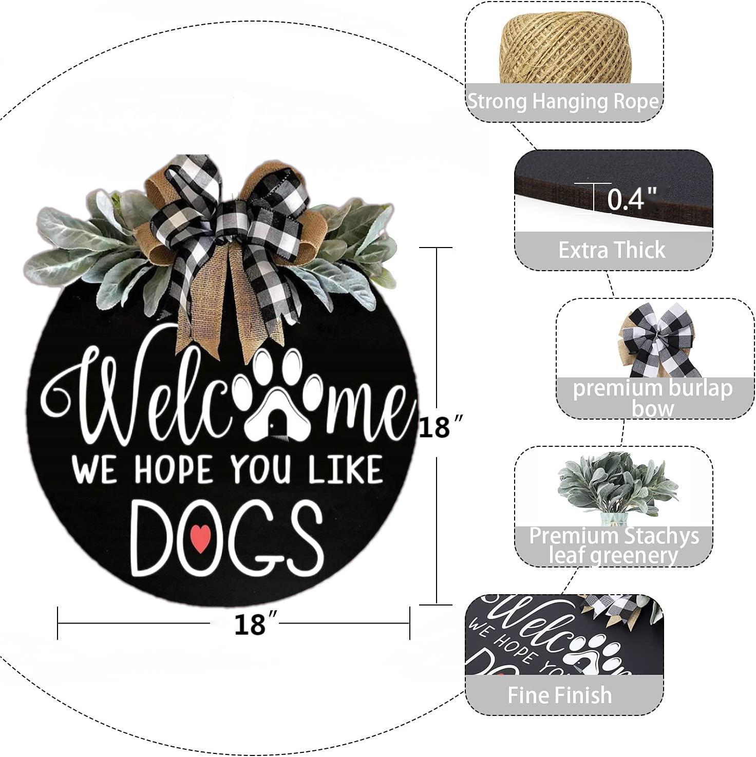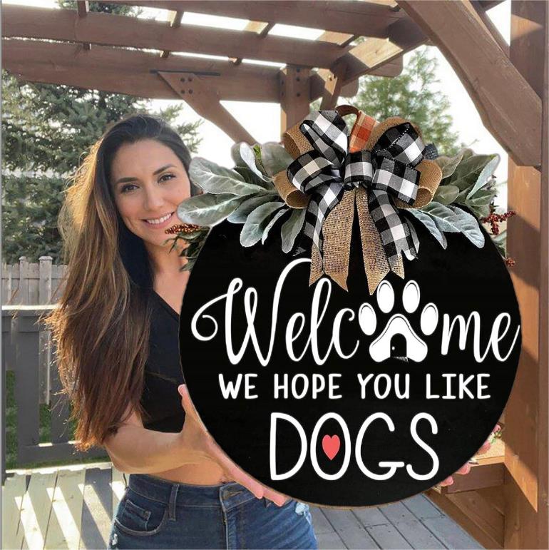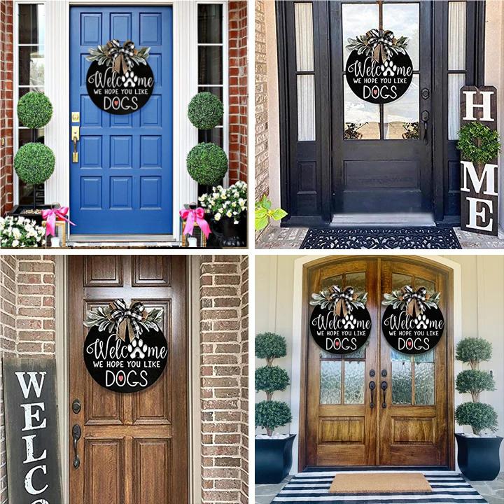 This is a welcome sign at the front door signs for dog owners - we hope you like dogs. Beautifully designed, it will make your guests feel that this is a warm house with cute dogs.