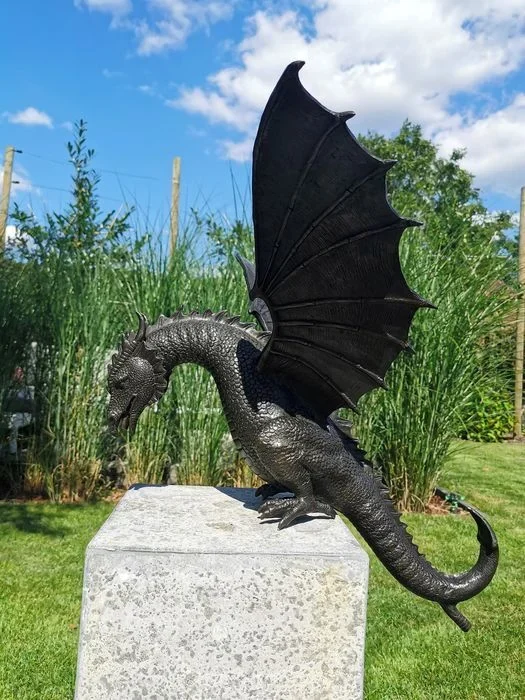 This Imitation Bronze Sculpture Fountain Dragon is from the world of mythical creatures and is a serpent like legendary beast that can fly with it’s wings outstretched nasty horns and breath fire and is generally regarded with fear. St George famously slayed the Dragon and they have been mentioned through the ages as monsters that should be tamed or over come. Often said to live in caves making them even more mysterious.